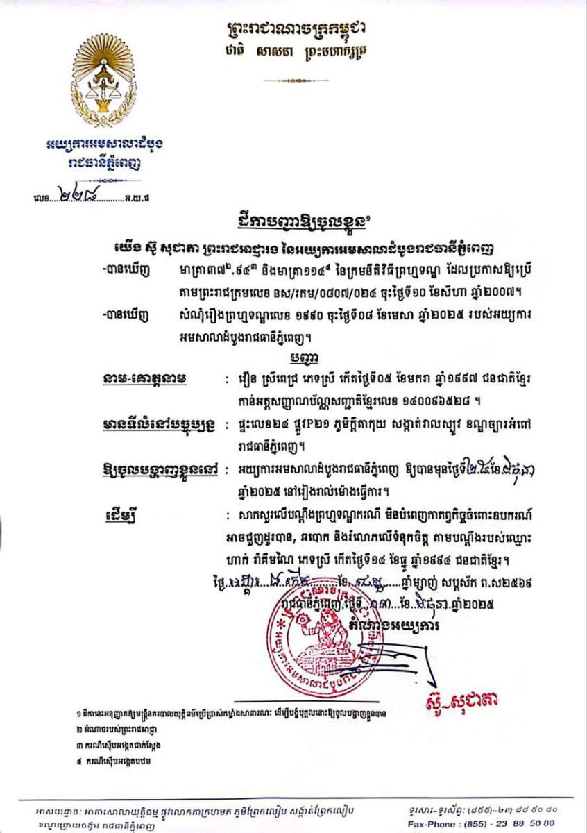 យោងតាមដីបញ្ជាឲ្យចូលខ្លួន ស្រ្តីរូបនោះមាន ឈ្មោះ វឿន ស្រីពេជ្រ មានគណនីហ្វេសបុក (Rose SuSu) ភេទស្រី អាយុ ២៨ឆ្នាំ ជនជាតិខ្មែរ មុខរបរចងការប្រាក់ បង្វិលលុយ រាប់លុយ ស្ថិតនៅផ្ទះលេខ២៤ ផ្លូវP២១ ភូមិក្តីតាកុយ សង្កាត់វាលស្បូវ ខណ្ឌច្បារអំពៅ រាជធានីភ្នំពេញ ត្រូវបានកម្លាំងសមត្ថកិច្ចនាំខ្លួនតាមពាក្យបណ្ដឹង សំណុំរឿងព្រហ្មទណ្ឌលេខ ១៩៩០ ចុះថ្ងៃទី០៨ ខែមេសា ឆ្នាំ២០២៥ របស់អយ្យការ អមសាលាដំបូងរាជធានីភ្នំពេញ ដើម្បីសាកសួរលើបណ្តឹងព្រហ្មទណ្ឌករណី មិនបំពេញកាតព្វកិច្ចចំពោះឧបករណ៍ អាចជួញដូរបាន, ឆបោក និងរំលោភលើទំនុកចិត្ត តាមបណ្តឹងរបស់ជនរងគ្រោះឈ្មោះ ហាក់ រ៉ាគីមណៃ ភេទស្រី អាយុ ៣១ឆ្នាំ ។