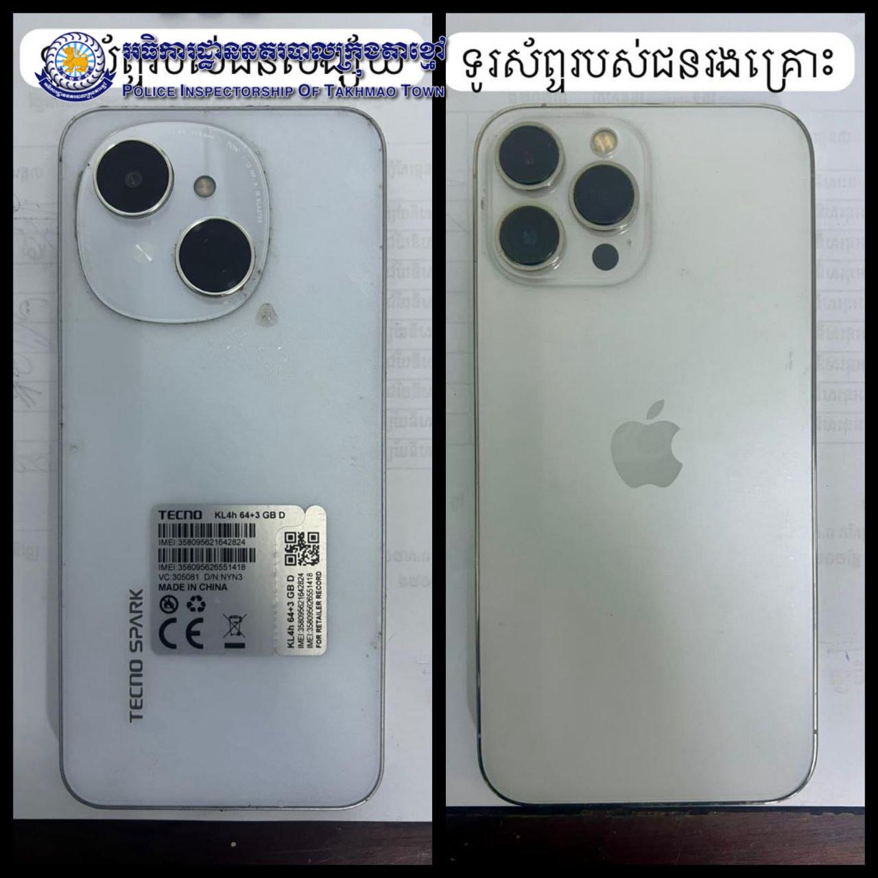 ដោយអនុវត្តតាមបទបញ្ជារបស់ លោកឧត្តមសេនីយ៍ទោ ឈឿន សុចិត្ត ស្នងការ នៃស្នងការដ្ឋាននគរបាលខេត្តកណ្តាល នៅថ្ងៃទី១៧ ខែមិថុនា ឆ្នាំ២០២៥ កម្លាំងនគរបាលក្រុងតាខ្មៅ ប៉ុស្តិ៍នគរបាលរដ្ឋបាលតាខ្មៅ ដឹកនាំបញ្ជាដោយលោកវរសេនីយ៍ឯក យី វណ្ណដា អធិការនគរបាលក្រុងតាខ្មៅ ធ្វើការបង្ក្រាបករណីជាក់ស្តែង អំពើឆក់ទូរសព្ទដៃ ០១គ្រឿង ម៉ាក iPhone 12 Pro Max ពីជនរងគ្រោះ ០១នាក់ (ស្រី) មុខរបរជាសិស្ស ចំណុចមុខសាលាអប់រំពិសេស ក្រោយធ្វើសកម្មភាពបានសម្រេច ជនរងគ្រោះក៏បានជិះដេញពីក្រោយស្រែកចោរ រហូតមកដល់ចំណុចរង្វង់មូលព្រែកសំរោង ជួបជាមួយកម្លាំងនគរបាលក៏បានឃាត់ខ្លួនសង្ស័យបានភ្លាមចំនួន ០២នាក់ រួមនឹងវត្ថុតាងទូរសព្ទដៃ ០២គ្រឿង និងម៉ូតូ ម៉ាក Honda Dream ពណ៌ខៀវ ០១គ្រឿង ក្នុងអំពើលួចមានស្ថានទម្ងន់ទោស(ឆក់ទូរសព្ទ)ចំណុចសាលាបឋមសិក្សា ស្ថិតក្នុងភូមិព្រែកសំរោង សង្កាត់តាខ្មៅ ក្រុងតាខ្មៅ ខេត្តកណ្តាល ។