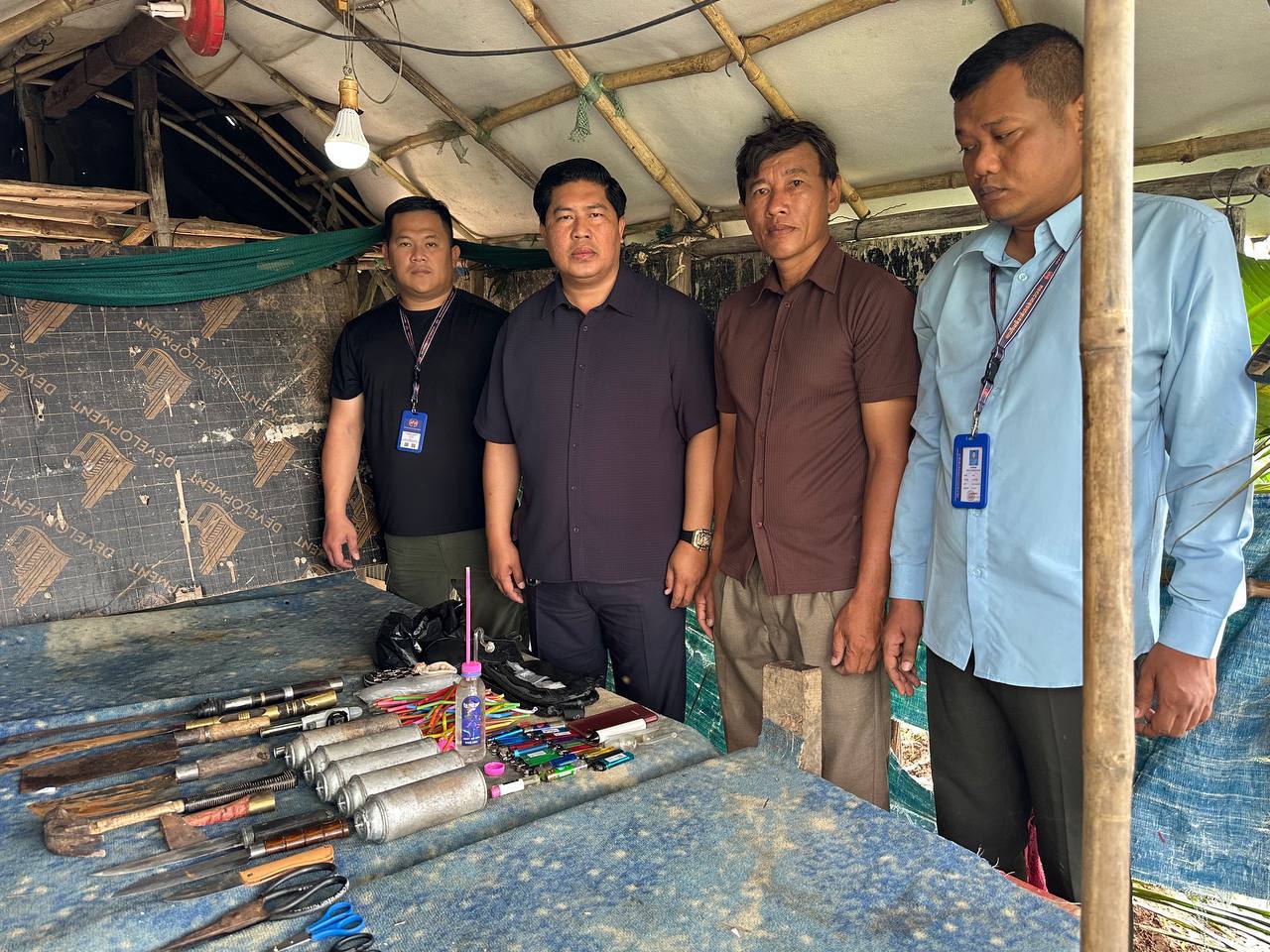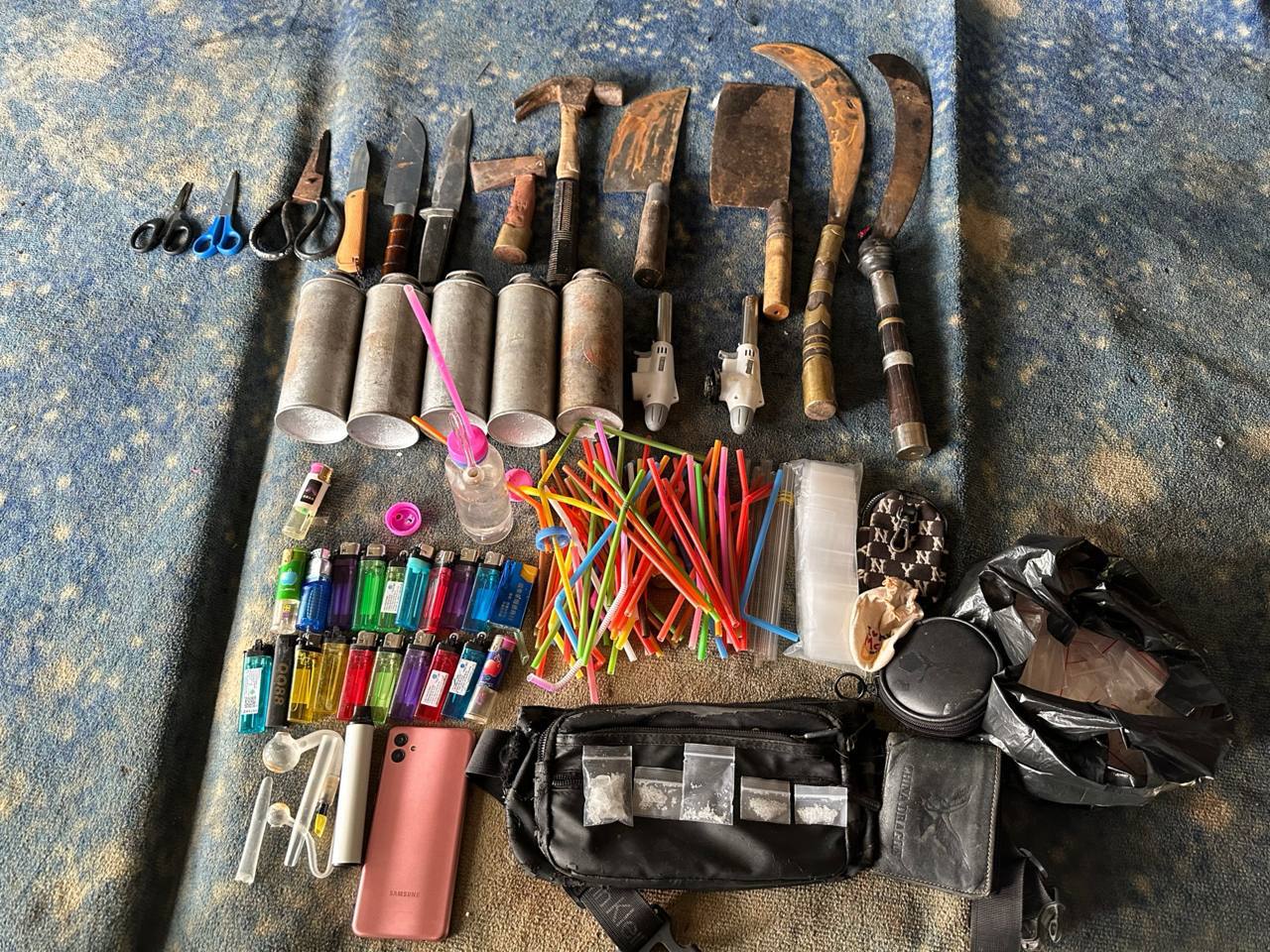 វត្ថុតាងចាប់យកបាន រួមមាន៖ ម្សៅក្រាមពណ៌ សថ្លា សង្ស័យជាសារធាតុញៀនចំនួន ០៥កញ្ចប់, ទូរសព្ទ ០១គ្រឿង ម៉ាក SAMSUNG, កាំបិតចំនួន ០៤ដើម, សម្ភារៈសម្រាប់វិចខ្ចប់ និងប្រើប្រាស់គ្រឿងញៀនមួយចំនួនទៀត ។