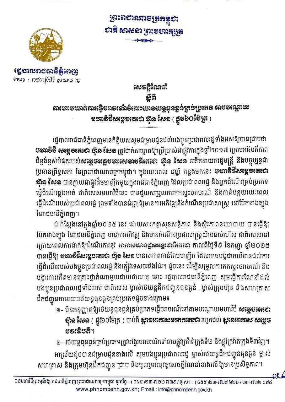 អាជ្ញាធររាជធានីភ្នំពេញ ហាមឃាត់ការធ្វើចរាចរណ៍ចំពោះយានយន្តធុនធ្ងន់គ្រប់ប្រភេទតាមបណ្តោយមហាវិថីសម្តេចតេជោ ហ៊ុន សែន (ផ្លូវ៦០ម៉ែត្រ) ដើម្បីជួយសម្រួលការកកស្ទះចរាចរណ៍ និងបង្ការការកើតមានគ្រោះថ្នាក់ណាមួយជាយថាហេតុ ដោយរដ្ឋបាលរាជធានីភ្នំពេញធ្វើការណែនាំដល់ប្រជាពលរដ្ឋទាំងអស់ ជាពិសេសម្ចាស់រថយន្តដឹកជញ្ជូនធុនធ្ងន់ ម្ចាស់ក្រុមហ៊ុន និងសហគ្រាស ដឹកជញ្ជូនតាមរយៈរថយន្តធុនធ្ងន់គ្រប់ប្រភេទ ត្រូវចូលរួមអនុវត្តសេចក្ដីណែនាំនេះ។