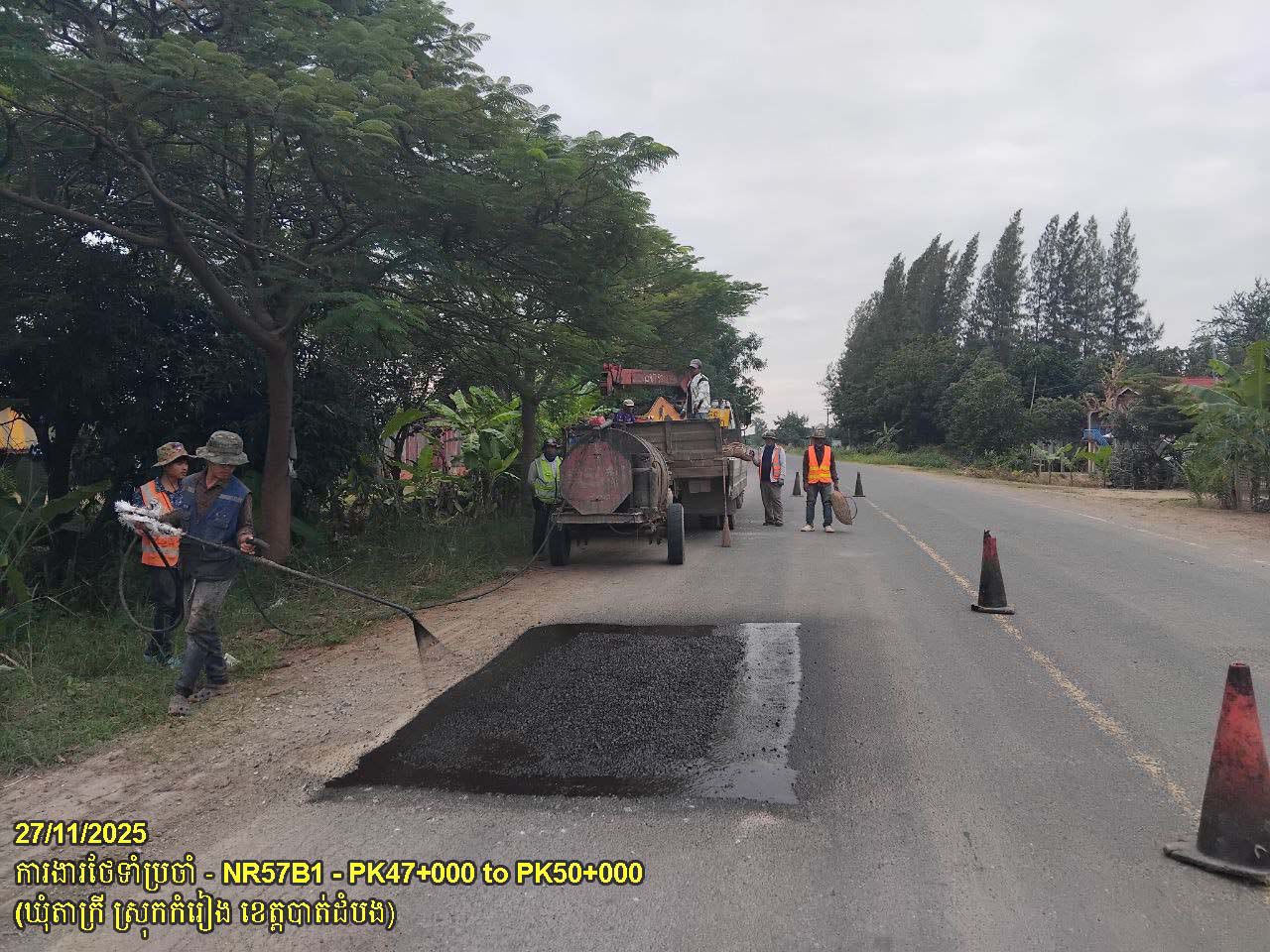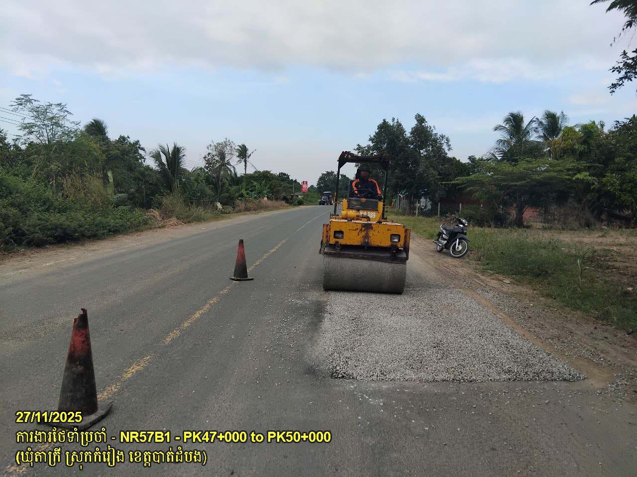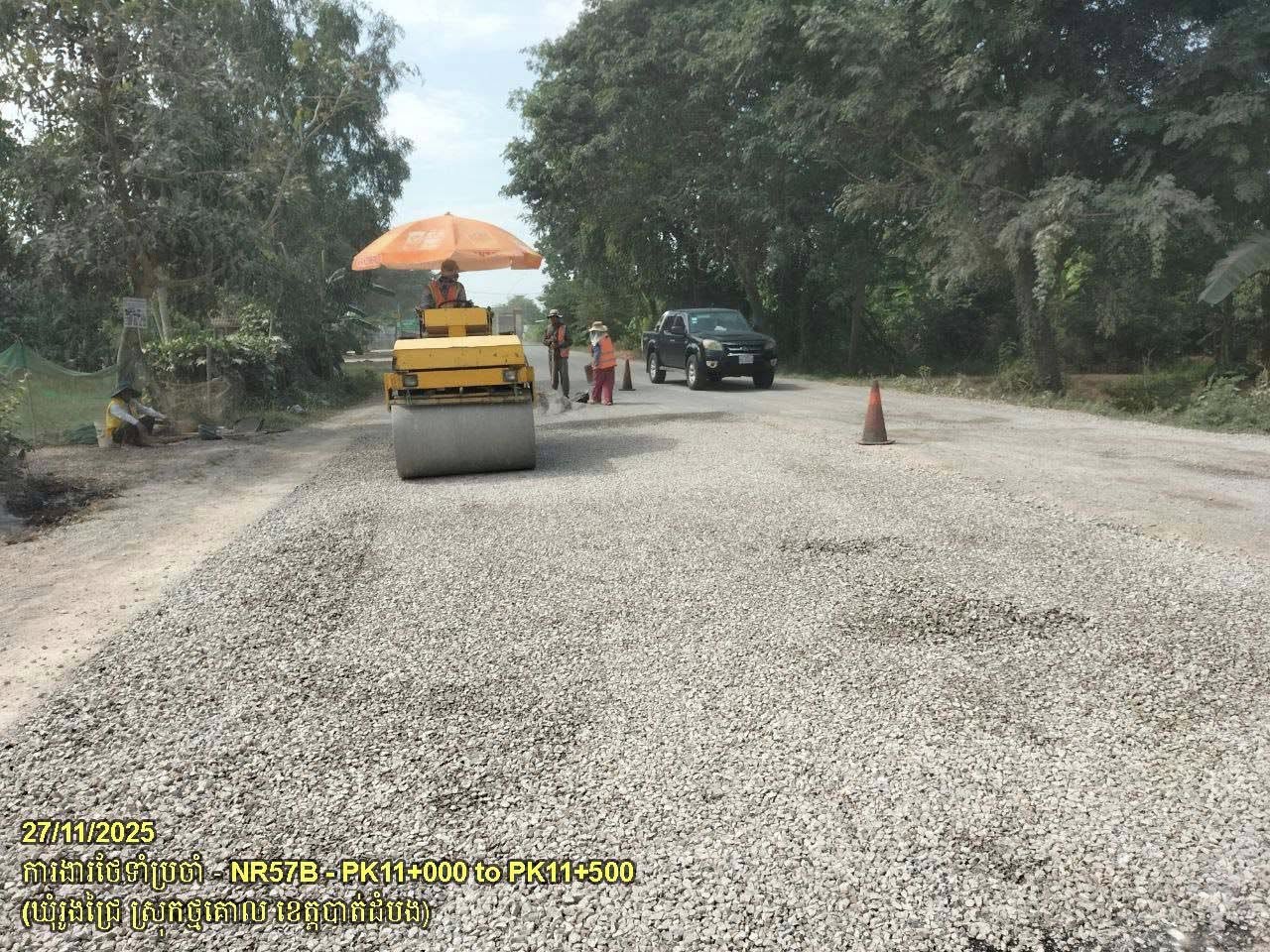 ៦. បន្តការងារថែទាំផ្លូវជាតិលេខ ៥៧B ៖ ការងារស្រោចកៅស៊ូ ជួសជុលលុបសំបុកមាន់ និងស្នាមប្រេះ ចន្លោះគ.ម១១+០០០ ដល់គ.ម១១+៥០០ ស្ថិតនៅឃុំរូងជ្រៃ ស្រុកថ្មគោល។