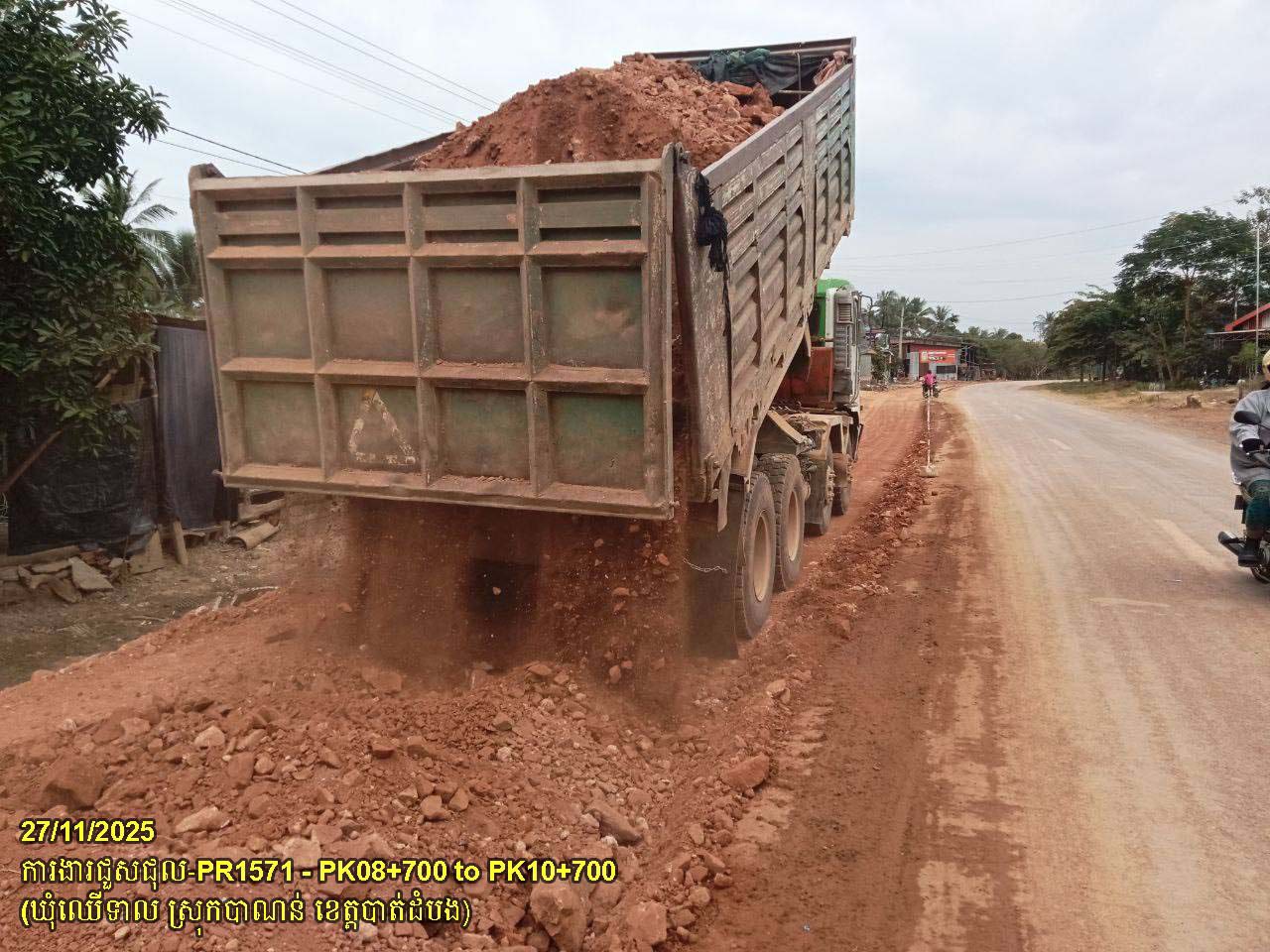 ៣. បន្តការងារជួសជុលផ្លូវខេត្តលេខ ១៥៧១៖ ការងារកាយដីគ្មានគុណភាពលើតួថ្នល់ពង្រីក ដឹកចេញ និងចាក់បំពេញដីល្បាយថ្ម ធ្វើគ្រឹះរង ចន្លោះគ.ម ០៨+៧០០ ដល់គ.ម១០+៧០០ ស្ថិតនៅក្នុងឃុំឈើទាល ស្រុកបាណន់។