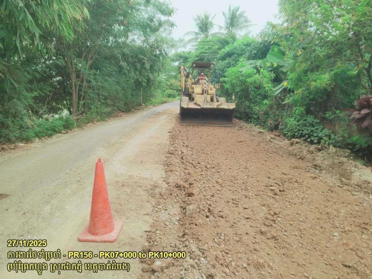 ១០. បន្តការងារថែទាំផ្លូវខេត្តលេខ ១៥៦ ៖ ការងារជួសជុលស្នាមផតស្រុត ដោយកាយដីគ្មានគុណភាព និងចាក់បំពេញថ្មម៉ិច រួចកៀរកិនបង្ហាប់ ចន្លោះគ.ម០៧+០០០ ដល់គ.ម១០+០០០ ស្ថិតនៅក្នុងឃុំព្រែកហ្លួង ស្រុកឯកភ្នំ។