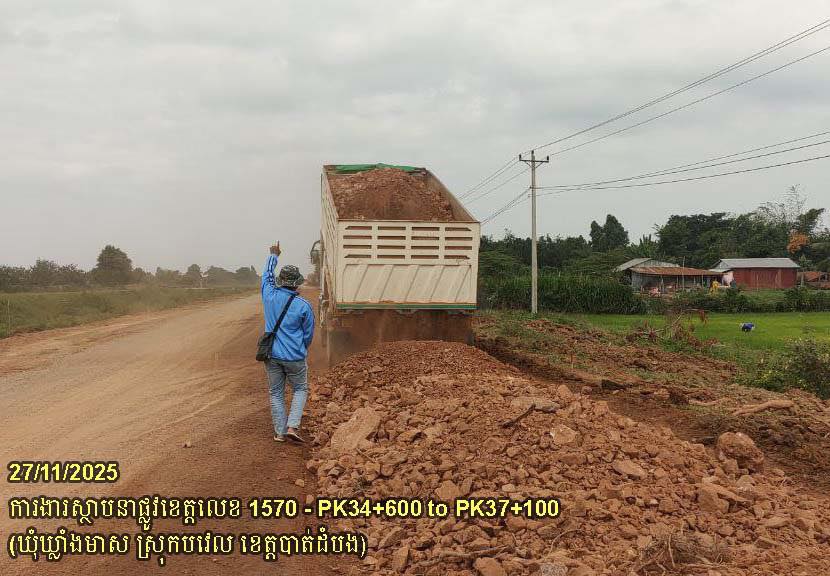 ២. បន្តការងារស្ថាបនាផ្លូវខេត្តលេខ ១៥៧០៖ ការងារកាយដីគ្មានគុណភាពលើតួថ្នល់ពង្រីក ដឹកចេញ និងកៀរកិនបង្ហាប់បាតគ្រឹះ ចាក់បំពេញដីល្បាយថ្ម ធ្វើគ្រឹះរង ចន្លោះគ.ម ៣៤+៦០០ ដល់គ.ម៣៧+១០០ ស្ថិតនៅក្នុងឃុំឃ្លាំងមាស ស្រុកបវេល។
